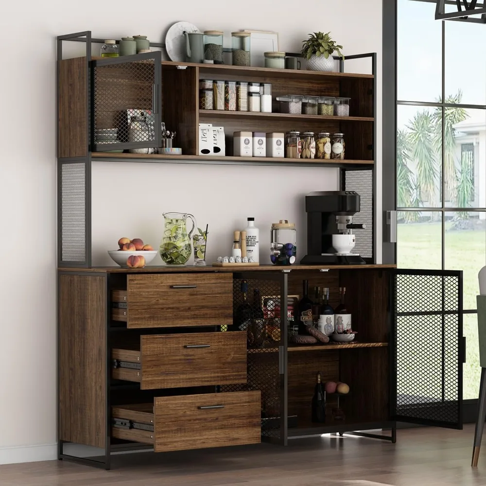 Large Kitchen Hutch Storage Cabinet, Pantry Cabinets with Hutch, Metal Frame Cupboard with Mesh Door, Drawer & Microwave Shelf,